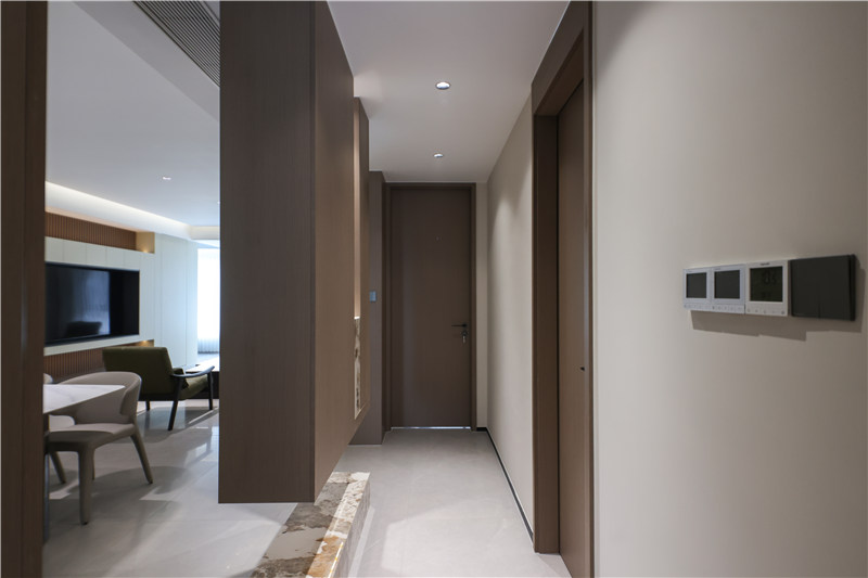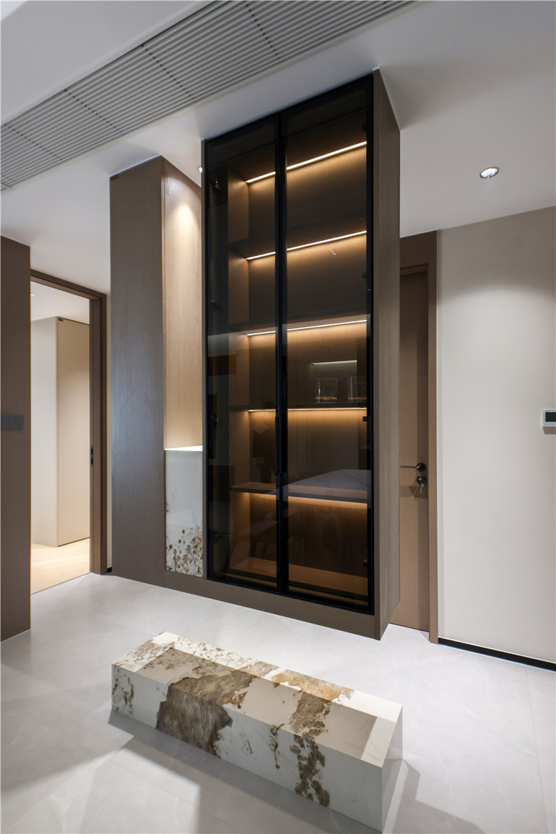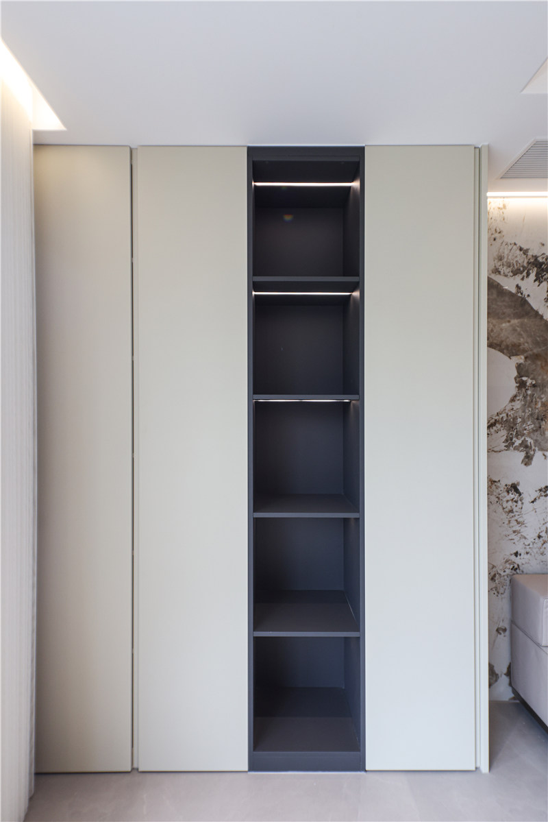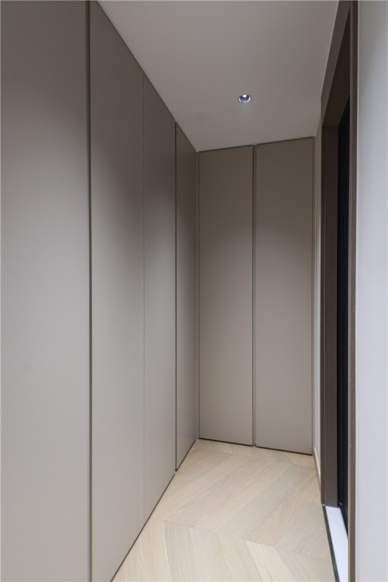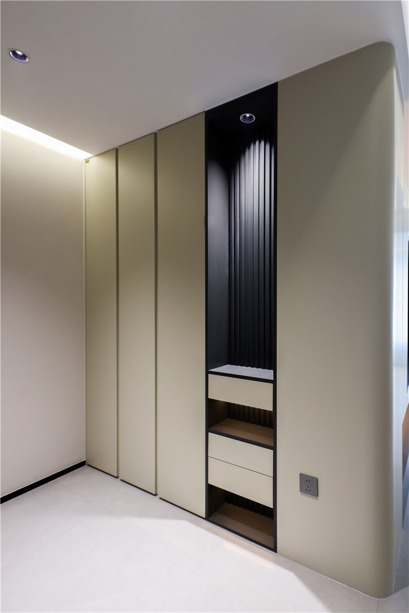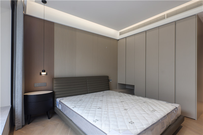 主臥進門一字型無拉手到頂柜延伸以床頭柜,區(qū)別于對側(cè)柱形柜,茶白色柔和雅致。