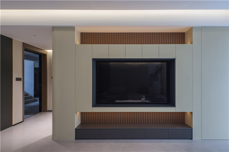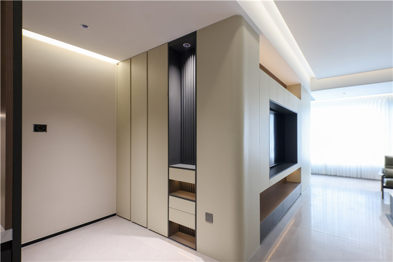 進門玄關(guān)柜與電視柜組合,連接處以圓弧收邊,杏仁黃色調(diào)通鋪展現(xiàn)高級柔和氣質(zhì)。玄關(guān)側(cè)邊高柜便捷掛衣,中側(cè)穿插抽屜、背板跳色配合以柵格造型,彰顯個性化美感。