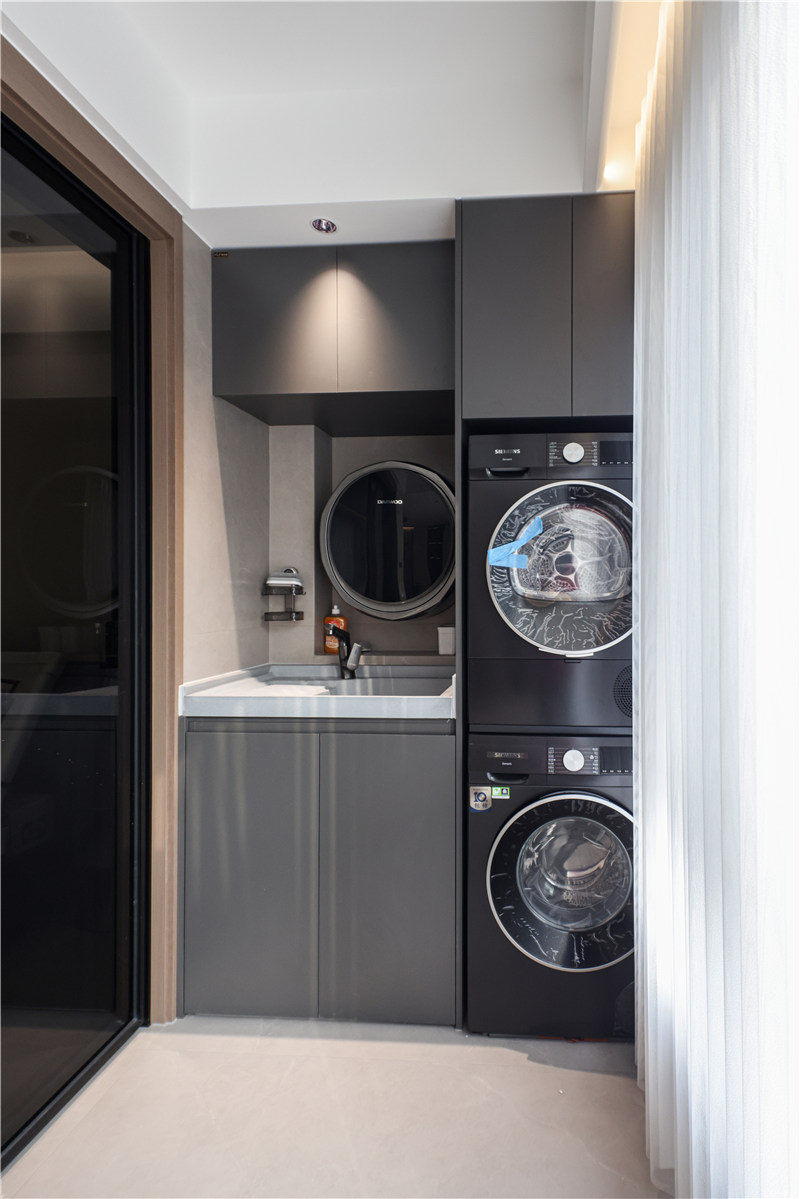 一側(cè)陽臺柜藏露結(jié)合,收納物件的同時可進行DIY裝飾;一側(cè)做洗烘一體式洗漱臺,可與男孩房共用,滿滿設(shè)計感。