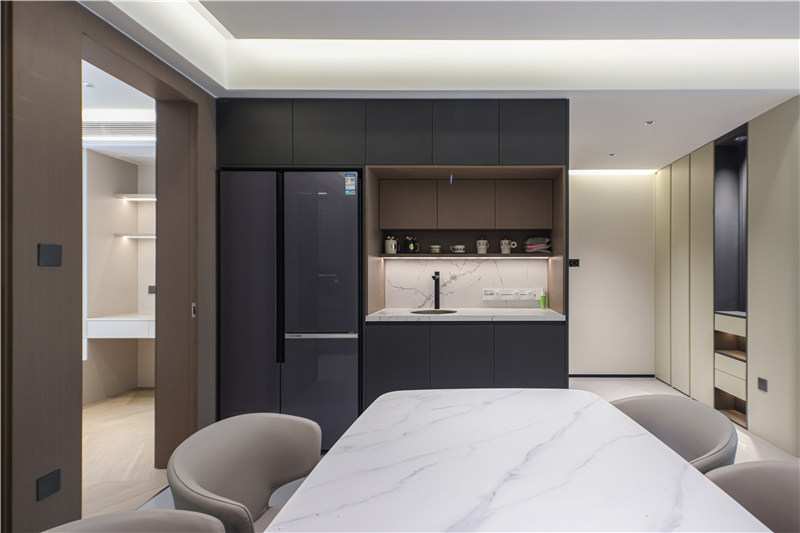 地柜+吊柜+高柜的組合形式保障多重收納,水洗灰門板以膚感成就質(zhì)感;高度、燈光、深度等協(xié)調(diào)統(tǒng)一,打造出高效空間。