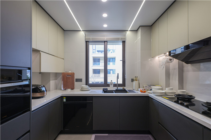 廚房U型構(gòu)造,以洗切烹盛動線提升烹飪效率,臺面巖板材質(zhì)耐磨耐刮防滲水。