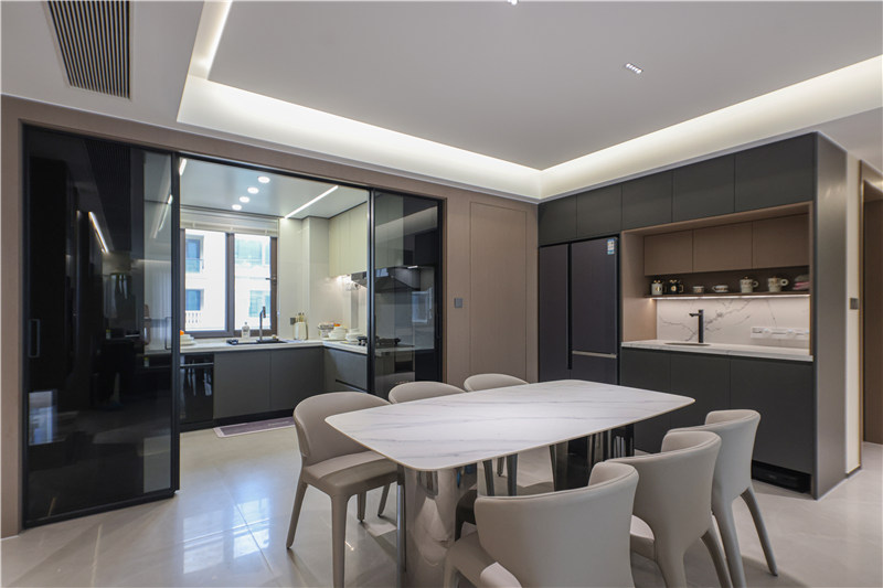 餐邊柜整體無拉手設(shè)計,將冰箱一整個嵌入其中,視覺和諧統(tǒng)一;中部掏空預(yù)留清洗區(qū),上方為餐具開放區(qū),便捷實用;底部留空可放掃地機器人等電器。