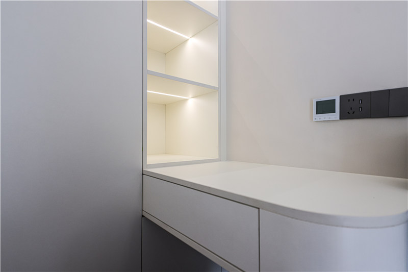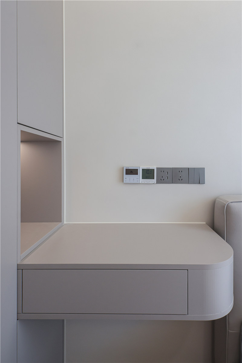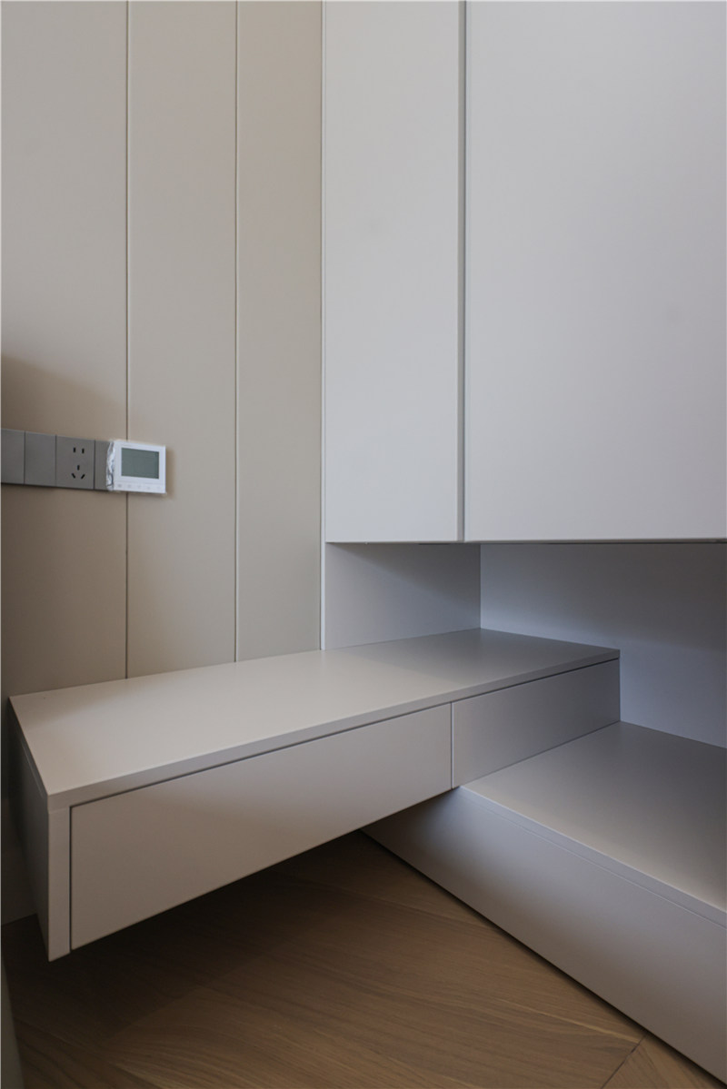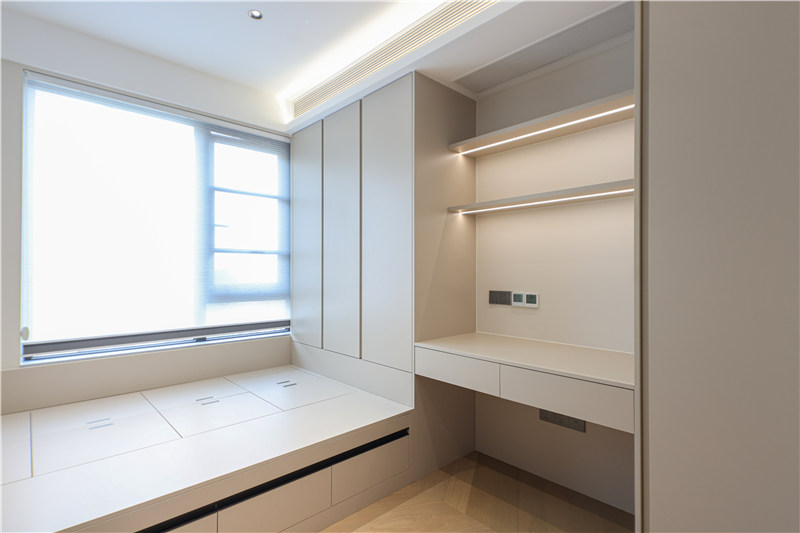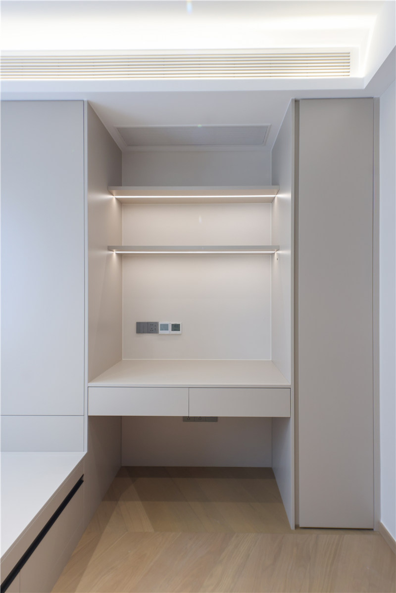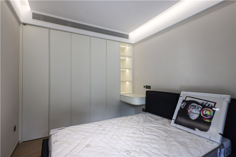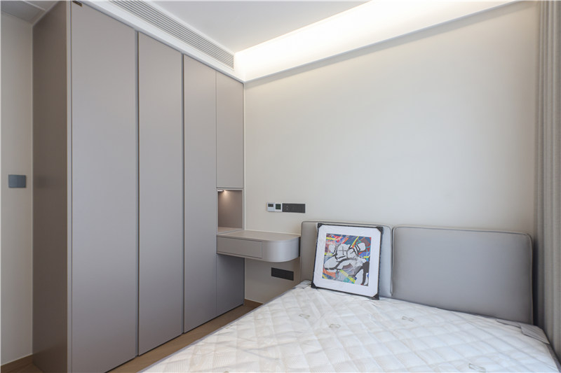 次臥為一體式設(shè)計,床、書桌、衣柜和諧統(tǒng)一,以銑槽及無拉手設(shè)計使得視覺清爽。