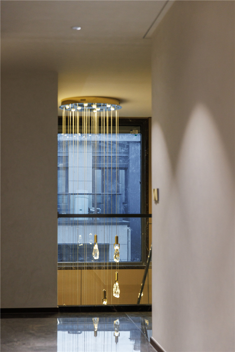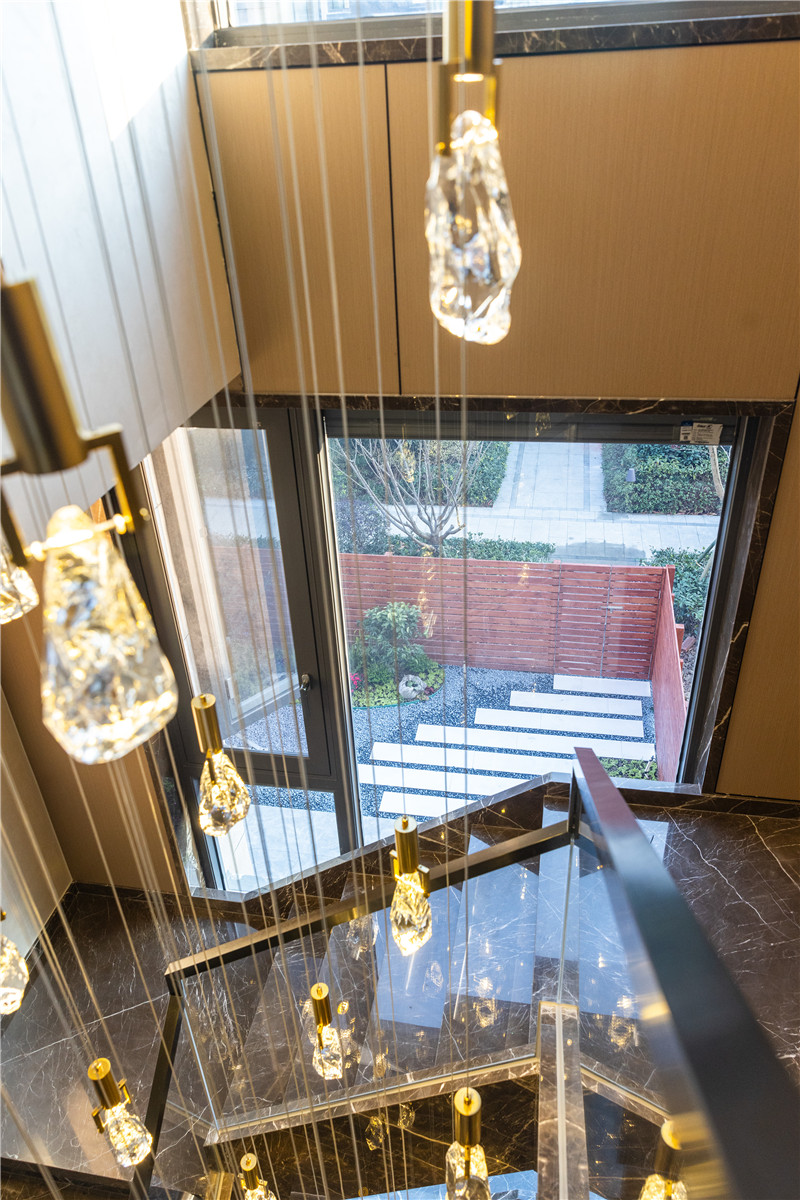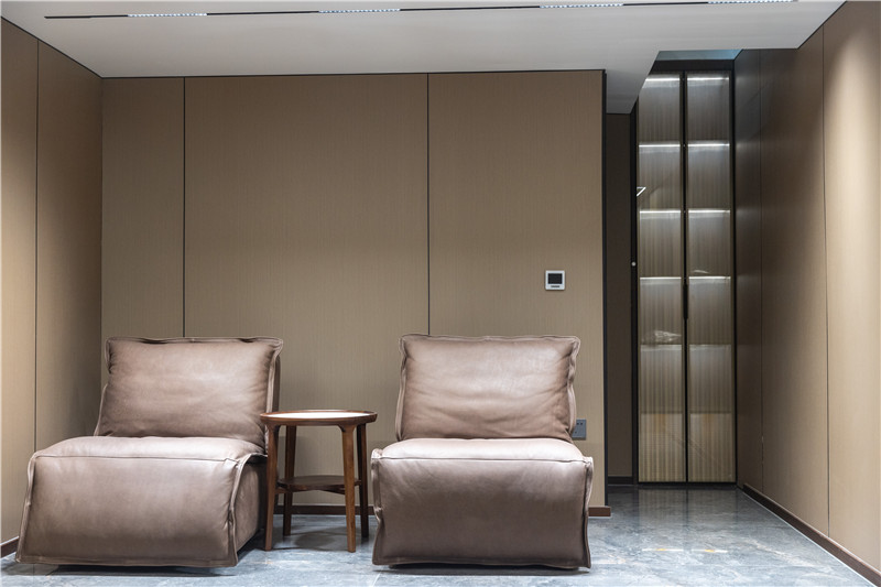 梯座上方設(shè)置休息區(qū),談心、小聚可在這里實現(xiàn);背側(cè)做狹長展示柜,夾絲玻璃、內(nèi)嵌燈帶,顏值UP!