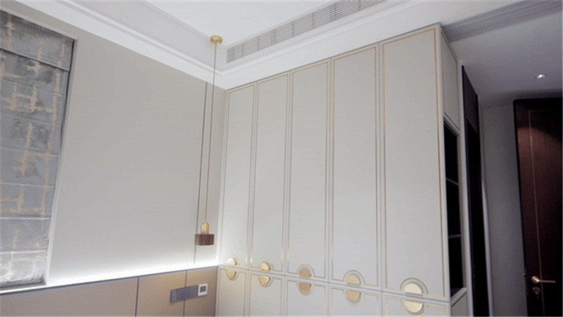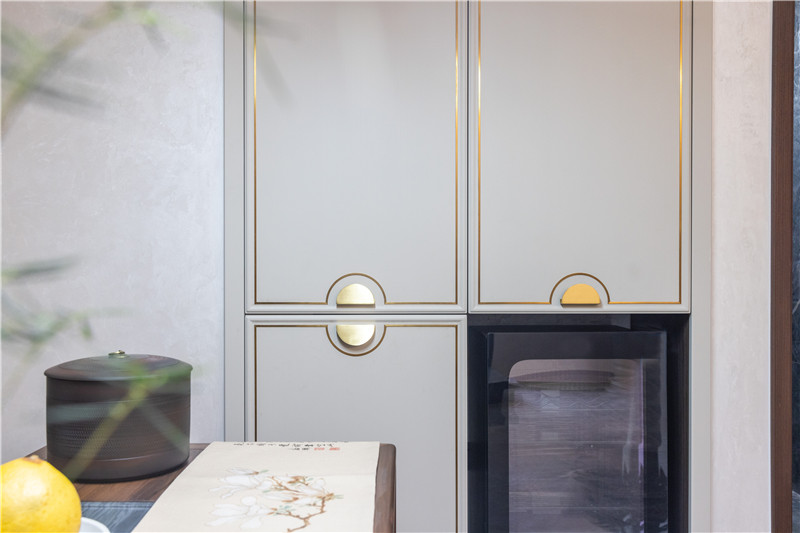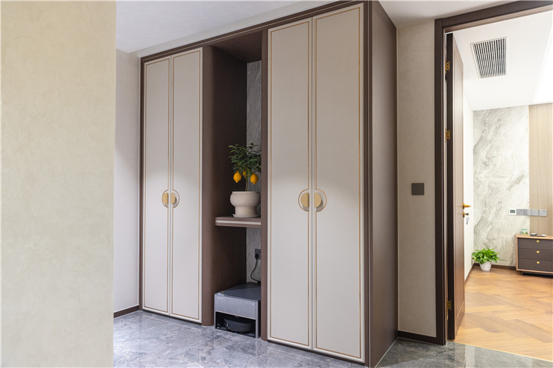 一組一柜到頂柜,中部隔層造景,加入換鞋凳并合理預(yù)留掃地機器人放置區(qū),合理且細(xì)致;兩側(cè)邊米褐色門板以金屬條點綴,配以中式扇形拉手,好看實用。