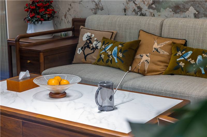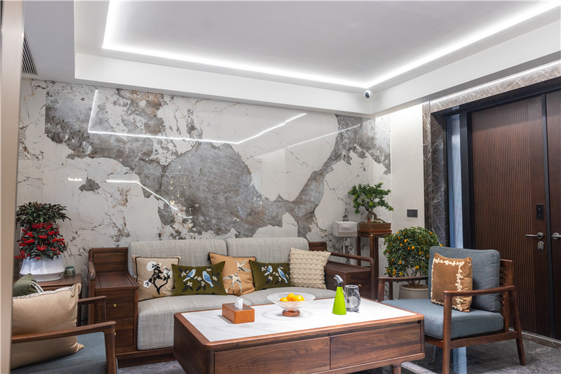 客廳采用中式圍合式構(gòu)造,茶幾、沙發(fā)、椅子為配套木材,方寸間的沉淀襯中式風(fēng)骨;沙發(fā)背景墻采用整面大理石紋板,亮光屬性呼應(yīng)輔助燈光,增加空間通透感。