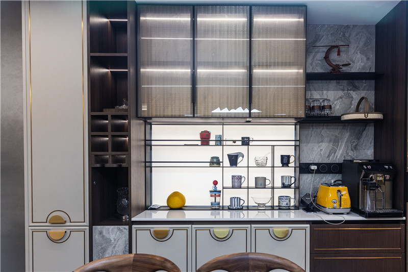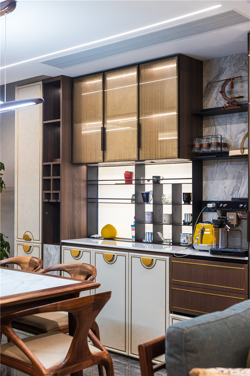 餐邊柜整體組合式構(gòu)造,煙熏橡木與米褐浮雕搭配,展現(xiàn)出高定美感;餐邊柜背板為大理石紋,中部為鋁板裝飾柜,打開燈光增強層次感。