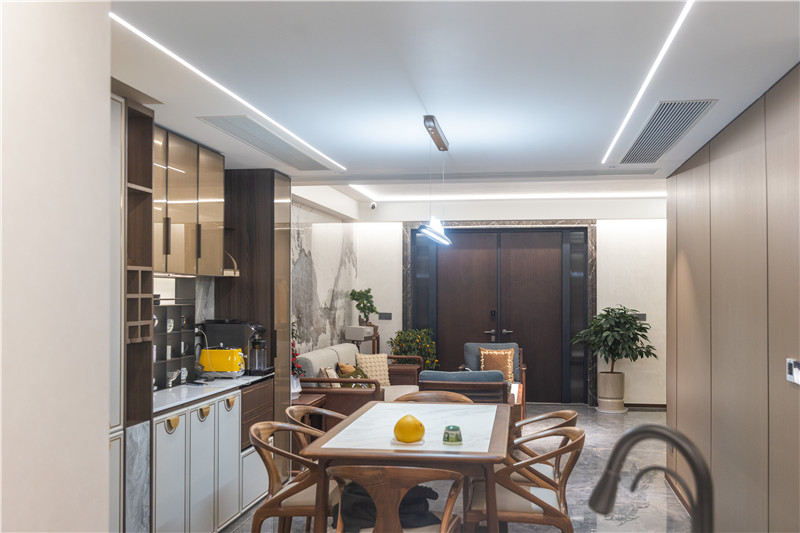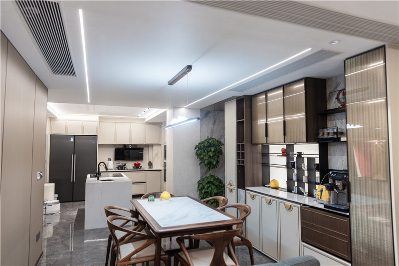 餐廚空間整體為開放式構(gòu)造,烹飪與用餐動線明晰,方便家庭成員共同參與其中;餐廚空間協(xié)調(diào)于整屋新中式裝修,主燈與輔燈結(jié)合式設(shè)計,空間敞亮。