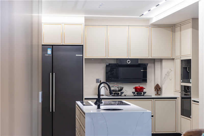 櫥柜上下柜無拉手設(shè)計,轉(zhuǎn)角處高柜嵌入烤箱等大電器,視覺和諧且收納力強;一側(cè)獨立式島臺,設(shè)置以洗水槽及嵌入式設(shè)備,分散櫥柜壓力。