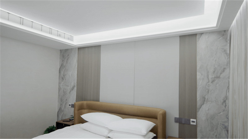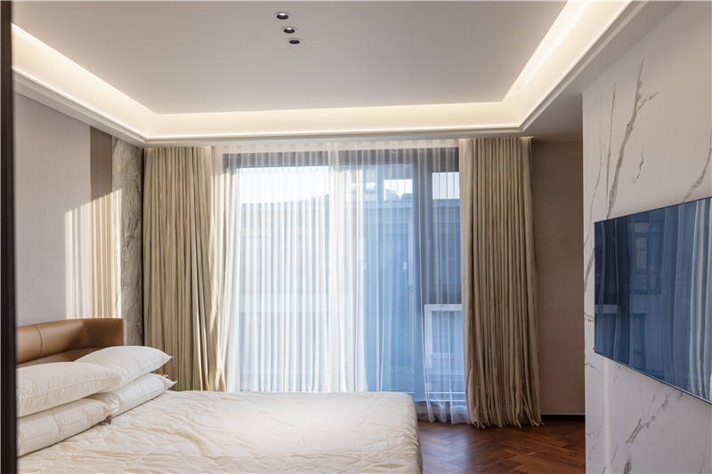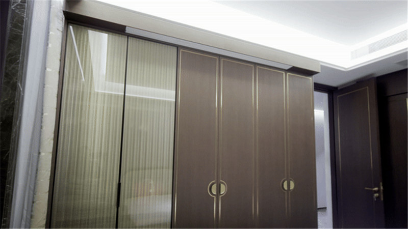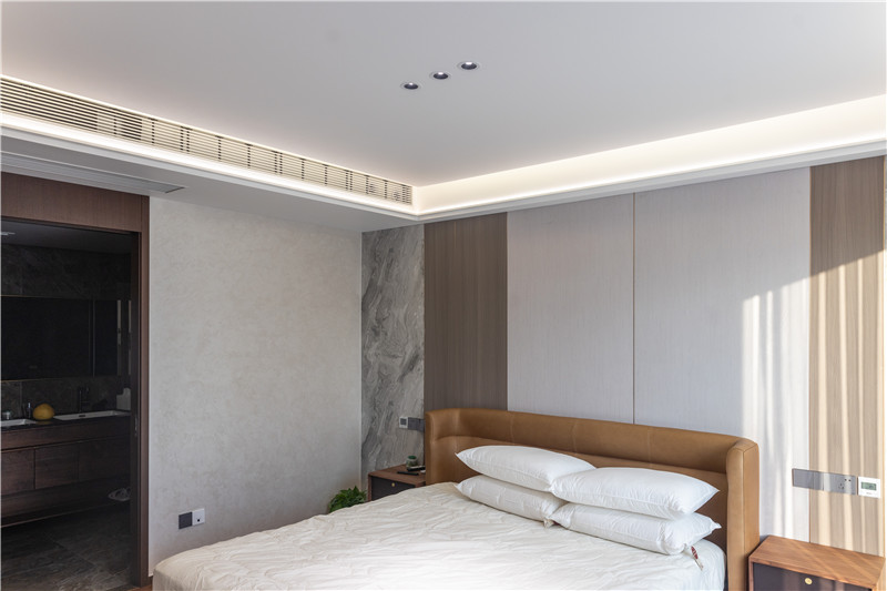 床頭背景墻木調(diào)與白調(diào)組合,提前預(yù)留好插座位置,實用便捷;床尾一字型組柜,夾絲玻璃為裝飾柜、木質(zhì)柜為收納柜,和諧統(tǒng)一。