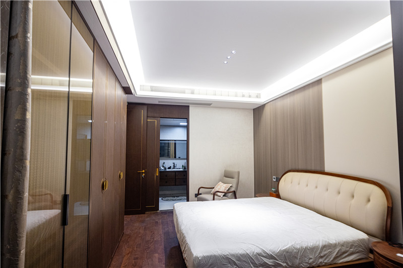 對側(cè)臥室中式風(fēng)里帶有古典氣韻,通過合理布局床、床頭柜、衣柜來有效利用空間。