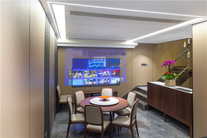 樓梯道裝修成小型家庭影院,擺上餐桌,一家人邊吃邊聊,幻燈片也不占地方;旁邊做了獨立式洗手臺柜體,發(fā)揮多重功能。
