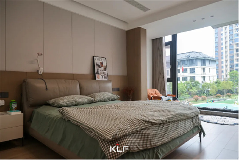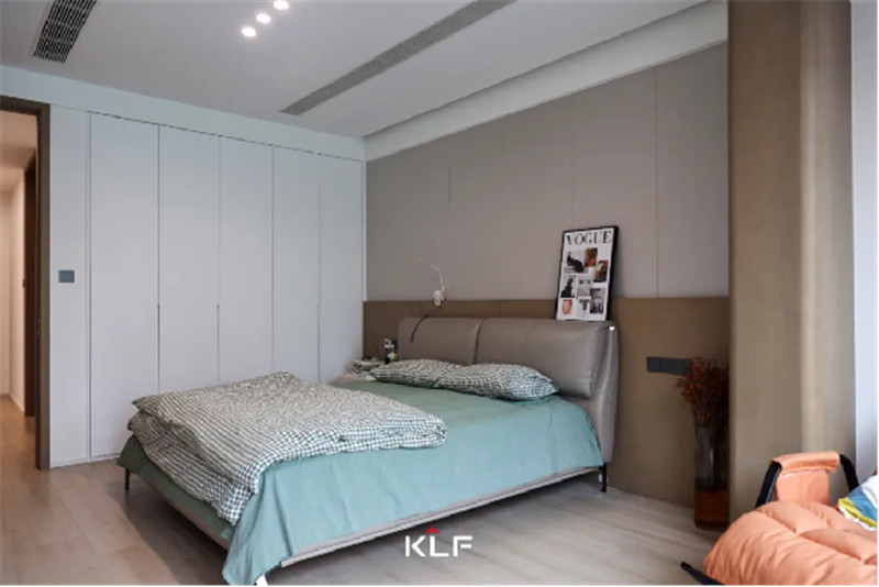 床頭背景墻與茶白衣柜組合出簡約美感