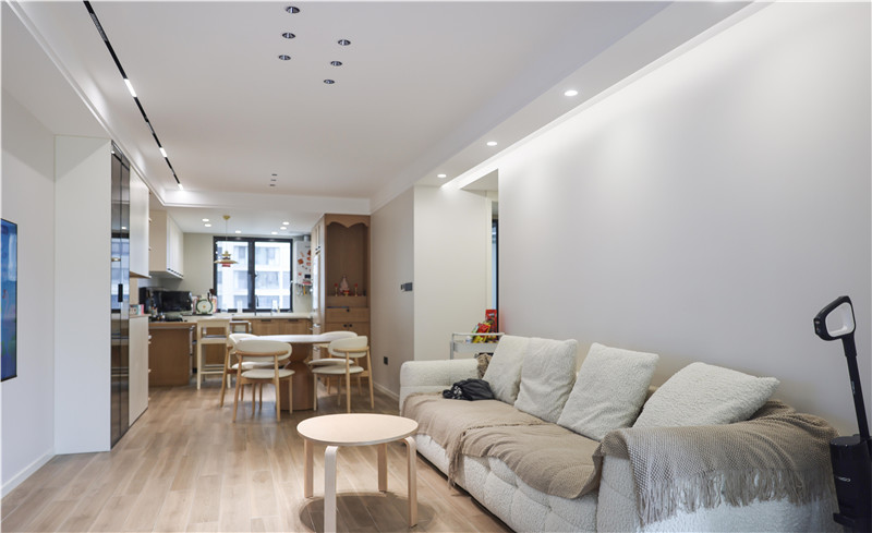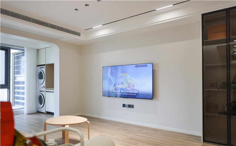 客廳區(qū)域以輕盈美學(xué)示人,避免蕪雜色彩和沉重結(jié)構(gòu)。兩處背景墻均采用純白墻面,通透布局疊加純凈色調(diào),營造明凈曠達(dá)的視覺感受。
