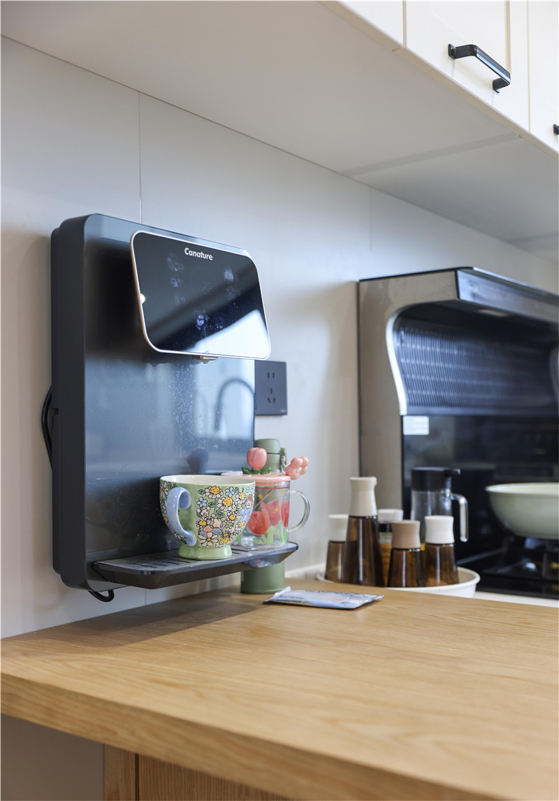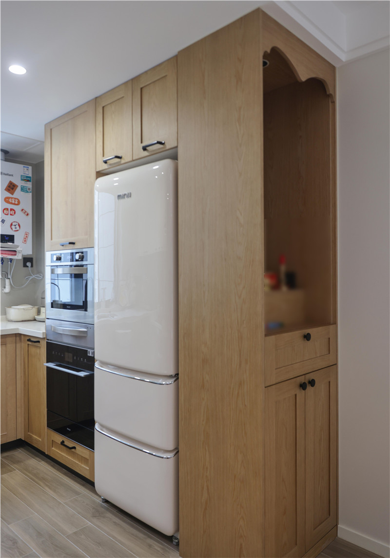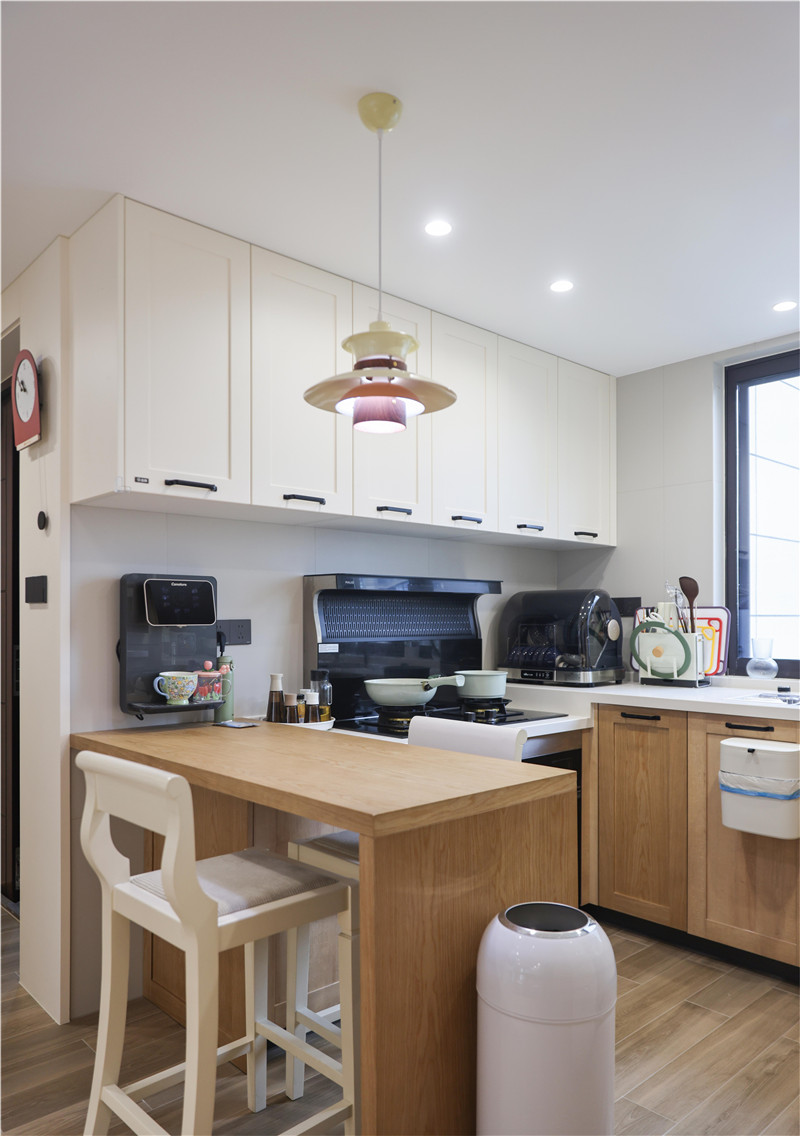 北歐橡木地柜帶有濃郁自然氣息的木作肌理,在空間中流露出精妙變化,與溫潤內(nèi)斂的芬蘭白吊柜形成視覺反差,豐富的空間層次讓四方食事更具質(zhì)感。