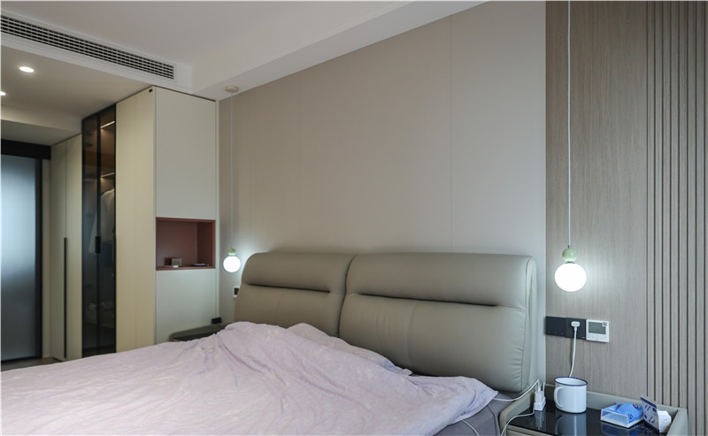 區(qū)別于客廳的四面落白,臥室整墻木飾面中和了空間結(jié)構(gòu)帶來的冷硬感,自然質(zhì)感與柔和燈光的和諧共鳴,喚起生活的溫情。