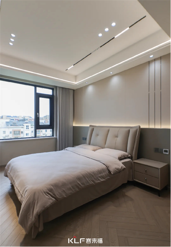 沿用了暖咖色的床頭背景墻設(shè)計(jì)