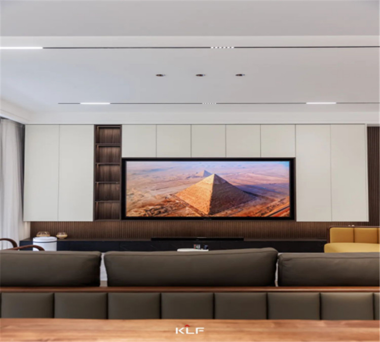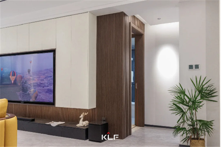 細(xì)格柵的造型墻板為墻面增加了立體感,一字型深灰色地柜直接落地,內(nèi)嵌3D霧化暖爐,帶給家更多溫馨。