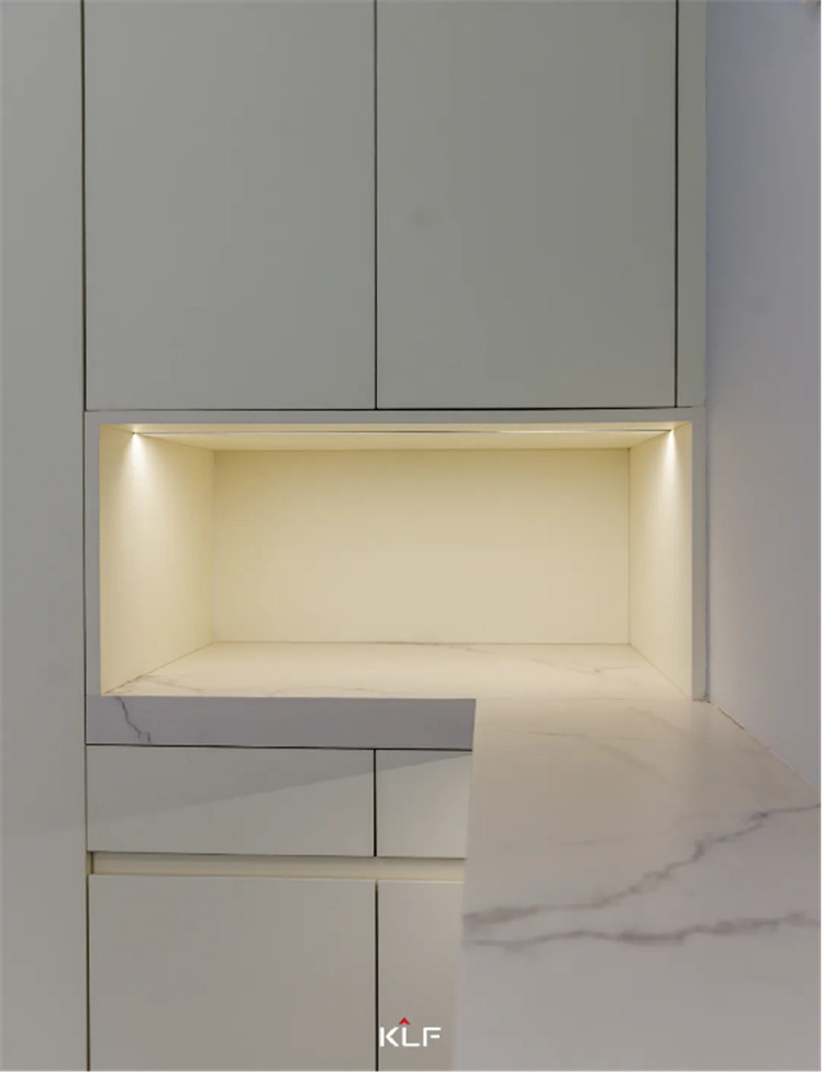 在玄關(guān)為了提升空間利用率,我們采用了嵌入式的柜體進(jìn)行上下分區(qū)收納。中部掏空后延伸大理石臺面作為置物臺,放置一些小物品都很實(shí)用。