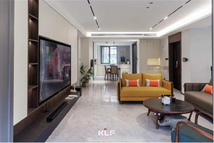 圍合式的空間布局里,電視柜成為環(huán)境的主角,以納科榆木打底,再以芬蘭白柜體進(jìn)行生活收納。