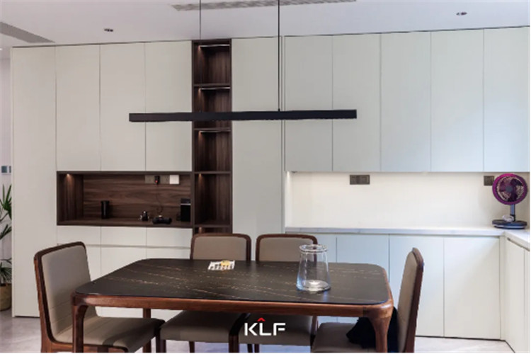 餐廚空間的設(shè)計風(fēng)格與起居空間保持一致,除了傳統(tǒng)的U型封閉式中廚外,在用餐區(qū)還做了高定全屋圍合的設(shè)計。