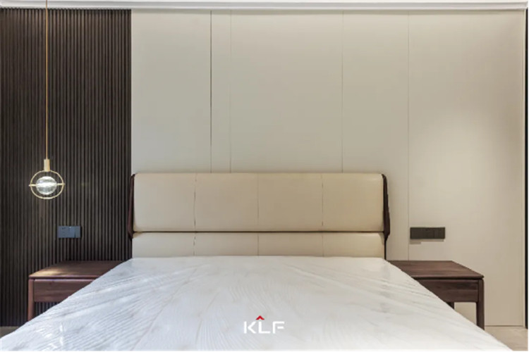 主臥的床頭背景也頗有意蘊(yùn),將拉槽墻板與格柵墻板進(jìn)行拼接,增加層次感和設(shè)計感,白棕配色高級又內(nèi)斂,是追逐質(zhì)樸生活的文雅格調(diào)。