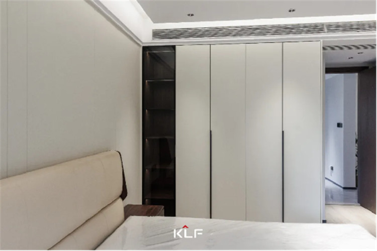 主臥空間延續(xù)一貫簡約的設(shè)計手法,注重提升家居質(zhì)感,強(qiáng)調(diào)人文的居住感受。自客廳格柵背景墻延伸至臥室空間,做成一體化的門套門框及門扇。