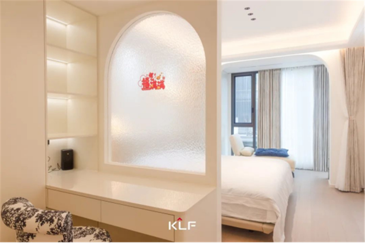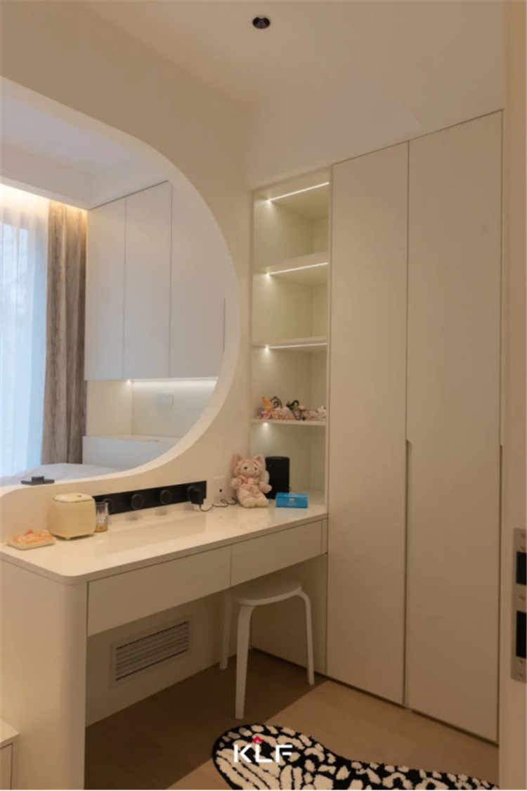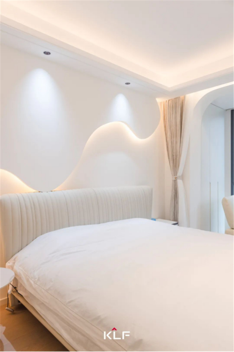 設(shè)計(jì)解鎖更加精簡(jiǎn)的生活方式,打造流暢的洄游動(dòng)線。以柜為墻圍合出一隅衣帽間和梳妝臺(tái),與主臥構(gòu)成嵌套關(guān)系,提升空間利用率和居住便利性。床頭背景墻、門(mén)洞埡口、玻璃隔斷,多處采用圓弧線條勾勒輪廓,具體而微的細(xì)節(jié),消弭大面積純色的乏味和單調(diào),交匯成生活的豐富質(zhì)感,滿足居住者的審美期待。