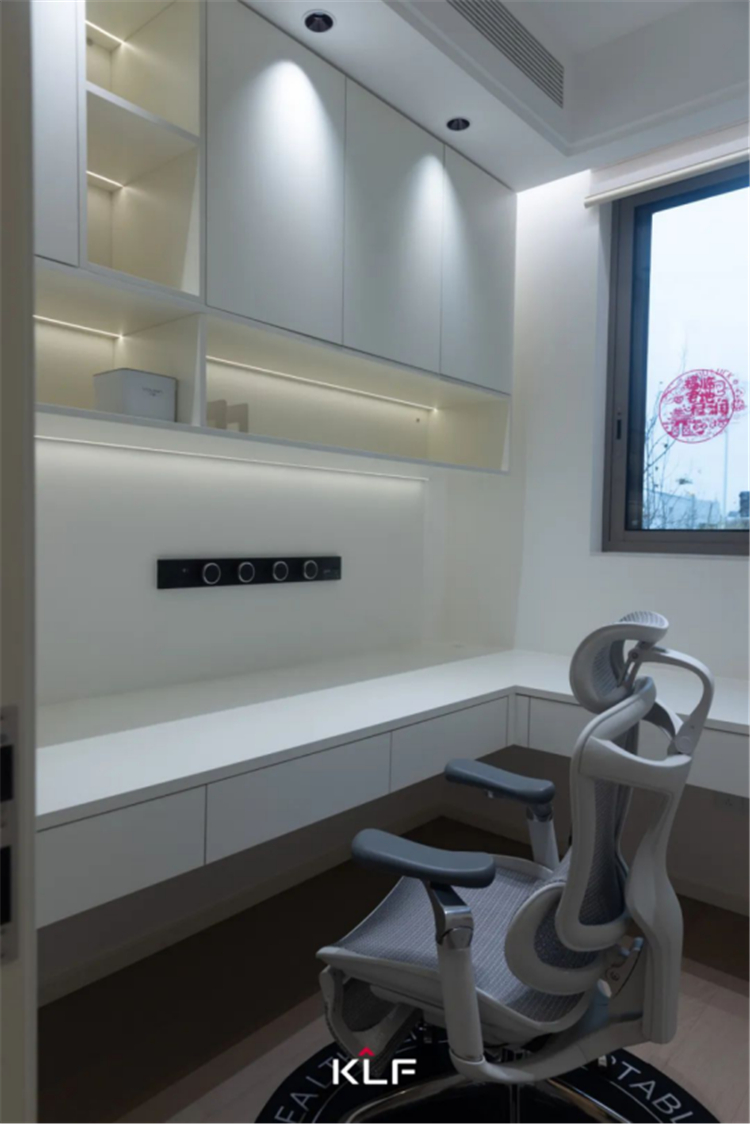盈于咫尺,乾坤造境。書(shū)房是一個(gè)能讓人沉浸式思考與放松的理想天地。作為業(yè)主自己的精神空間站,書(shū)房靠墻定制吊柜和懸挑書(shū)桌,精簡(jiǎn)有序、寬敞通透,強(qiáng)大的收納功能將瑣碎盡數(shù)歸置。