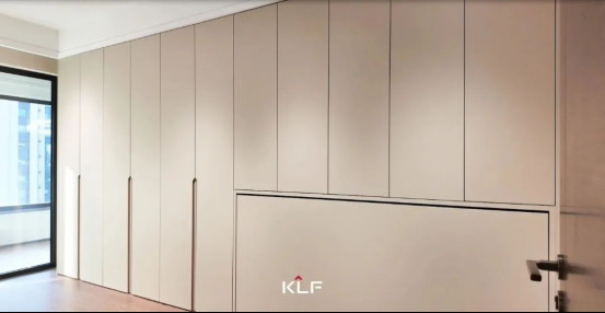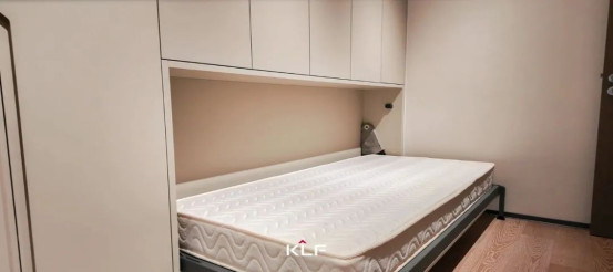衣帽間采用“一門到頂”的設(shè)計(jì),柜體與墻面接縫處不留縫隙,減少衛(wèi)生死角。衣柜內(nèi)部結(jié)構(gòu)合理,分區(qū)明確。銑槽拉手柜門平整順滑,強(qiáng)迫癥黨看了表示超舒服。折疊床柜一體設(shè)計(jì)暗含巧思,打開便是一張折疊床,偶有客人留宿不是問題。