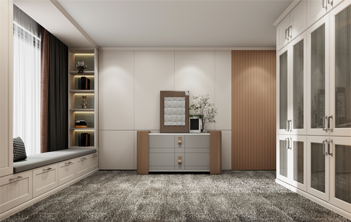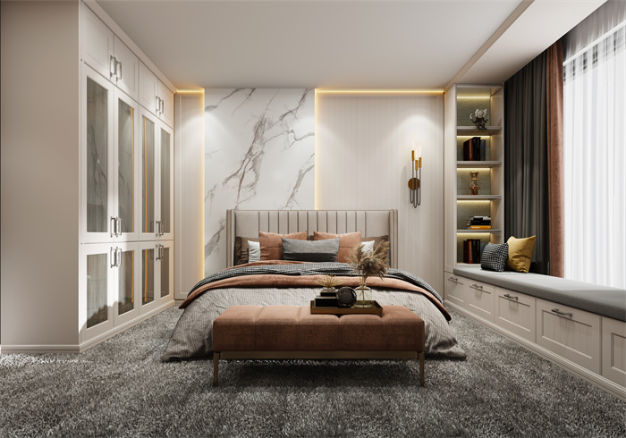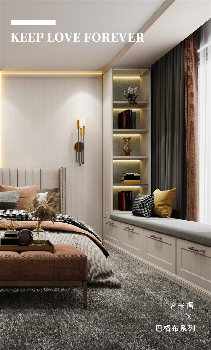 臥室的柵格背景墻和模壓護(hù)墻,做出了?定混油的產(chǎn)品效果,超晶板和巖板等超現(xiàn)代感的元素的融入, 更是將簡(jiǎn)歐這?經(jīng)典風(fēng)格產(chǎn)品做了顛覆,更符合當(dāng)下消費(fèi)?群讓客戶生活更加自然。