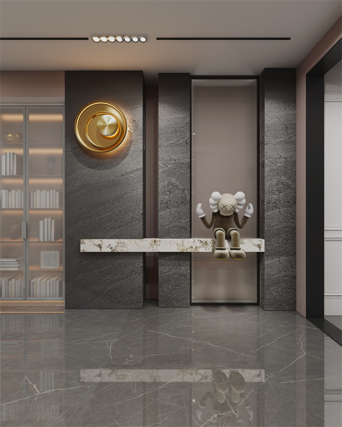 ?戶空間造景區(qū)與鞋柜相互呼應(yīng),精致的?虹玻璃作為情緒與視覺的點(diǎn)睛,填充空間空?的同時(shí),也衍生出生活美學(xué)的設(shè)計(jì)感與儀式感。