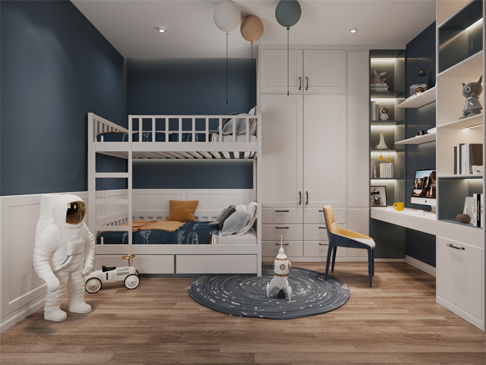 兒童房空間延伸了設(shè)計(jì)的?彩主題,不同飽和度的藍(lán)色配合深邃的星空藍(lán),冷靜并充滿思考,L形的設(shè)計(jì)也被充分利用。