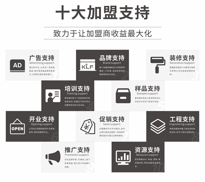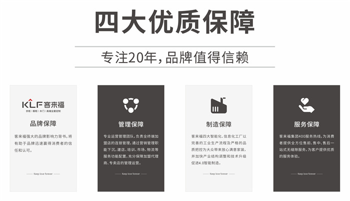 客來福專注產(chǎn)品研發(fā),在定制家居行業(yè)中力爭(zhēng)上游,是一家集研發(fā)、銷售、生產(chǎn)、售后于一體的大規(guī)模個(gè)性化定制家居品牌。如今,面對(duì)市場(chǎng)衍生出的新需求,客來福洞察新的發(fā)展機(jī)遇,以全新的商業(yè)模式,四大優(yōu)質(zhì)保障,五步無憂經(jīng)營以及十大加盟支持,給予每一位加盟商放心、安心、良心的加盟支持,更滿足消費(fèi)者不斷變更和升級(jí)的家裝需求。