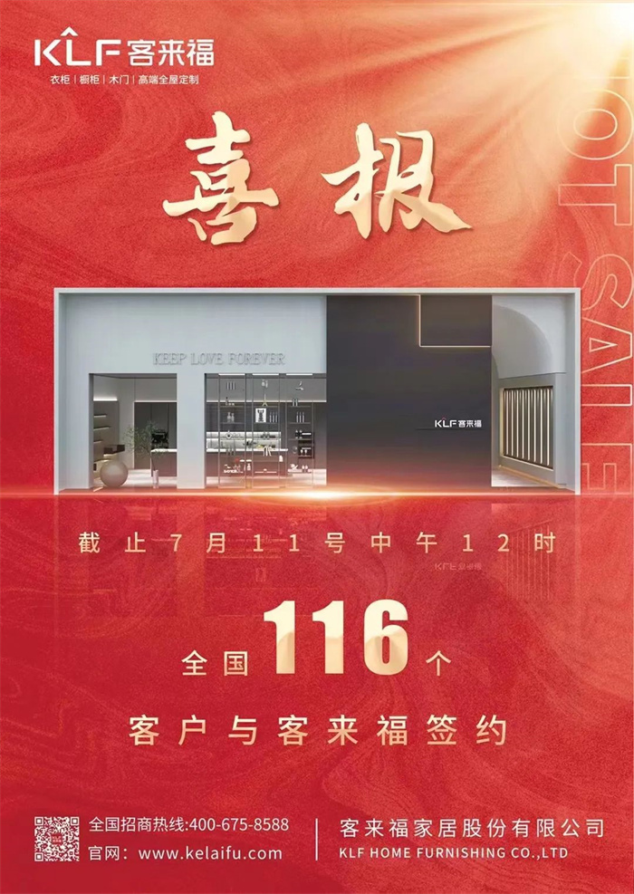 此次展會(huì)截止7月11日中午12時(shí),客來福與全國共116個(gè)新客戶簽約,優(yōu)渥的實(shí)力才是強(qiáng)大的核心。客來福全體家人共同奮進(jìn),在時(shí)代的洪流中重振旗鼓,突破下一個(gè)定制家居新階段!