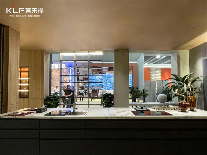 將客廳與開放式廚房打造成整體空間是升級的亮點之一,PET的工藝幫助我們實現(xiàn)嵌入式的內(nèi)置功能,比如衛(wèi)生間的燈光和冰箱。除此之外,整家定制也是客來福今年的著力點,多功能的產(chǎn)品柜和開放式的設(shè)計模糊了空間界限。根據(jù)消費者對于一站式一體化的消費需求提供了解決方案。