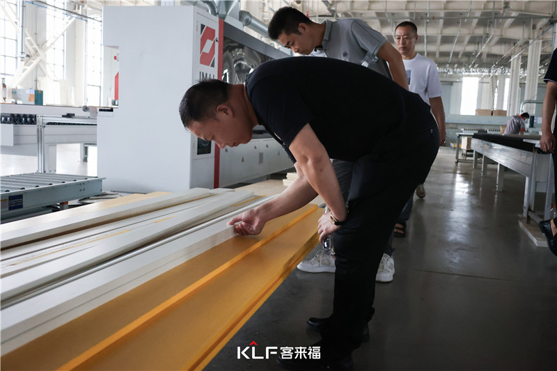 2023年7月16日,客來福鐵三角運(yùn)營團(tuán)隊和新商匯合,一行人走進(jìn)華東新橋生產(chǎn)基地,領(lǐng)略客來福水漆車間的生產(chǎn)潛力。大家對于德國伊瑪激光封邊機(jī)的封邊效果表示贊賞,生產(chǎn)線的智能化讓大家對客來福的交付能力放心。