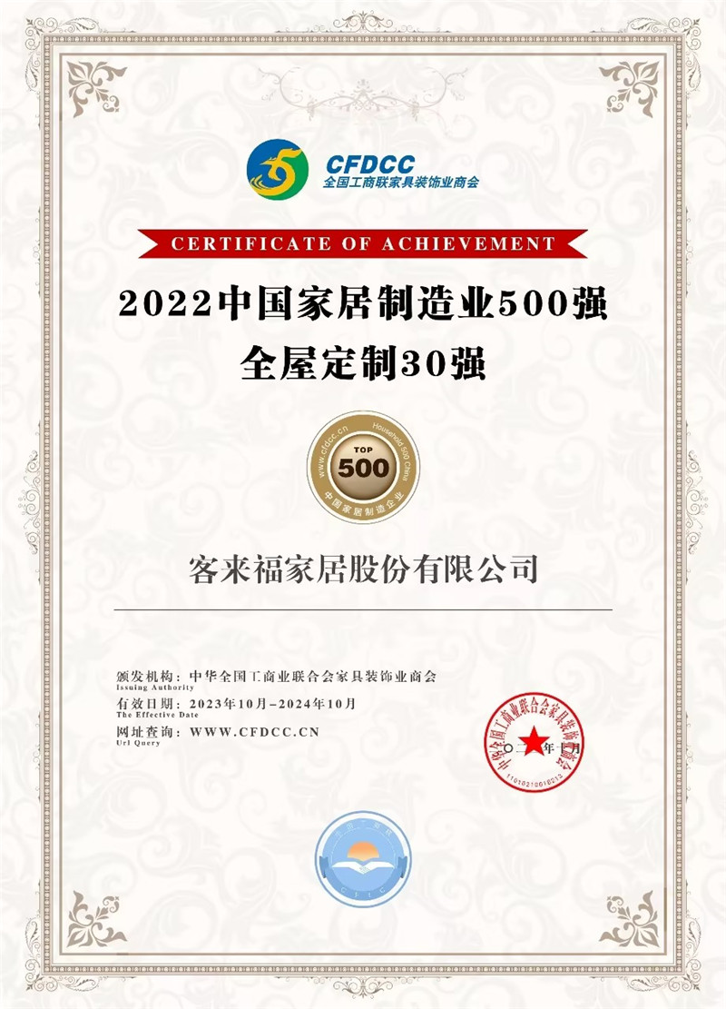 祝賀!客來福家居股份有限公司獲得2022中國家居制造業(yè)500強、全屋定制30強榮譽
