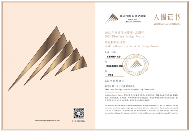 近日,2023年喜馬拉雅?設計之巔獎隆重盛啟,客來福定制家居受邀參與評選,在近千幅參評作品中脫穎而出。旗下作品“蝶變”系列入圍定制家居設計獎、作品“臻·至系列”入圍居住空間設計獎、作品“水晶蝴蝶”拉手入圍高定材料設計獎,得到了評審的一致好評。實力彰顯中國品牌設計力量。