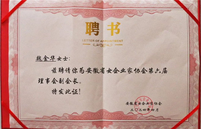 經(jīng)過篩查與素質(zhì)的綜合評定,客來福智能科技股份有限公司總裁魏金華被聘請為安徽省女企業(yè)家協(xié)會第六屆副會長,體現(xiàn)了協(xié)會對魏金華女士工作的認(rèn)可,這不僅是一份榮譽(yù),更是一份激勵(lì)。