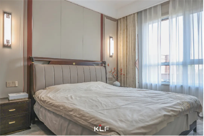新中式床頭背景墻,勾勒出一個寧靜悠遠的意境,搭配色調(diào)淡雅的復(fù)古燈具,方寸之間皆是風(fēng)雅韻味。