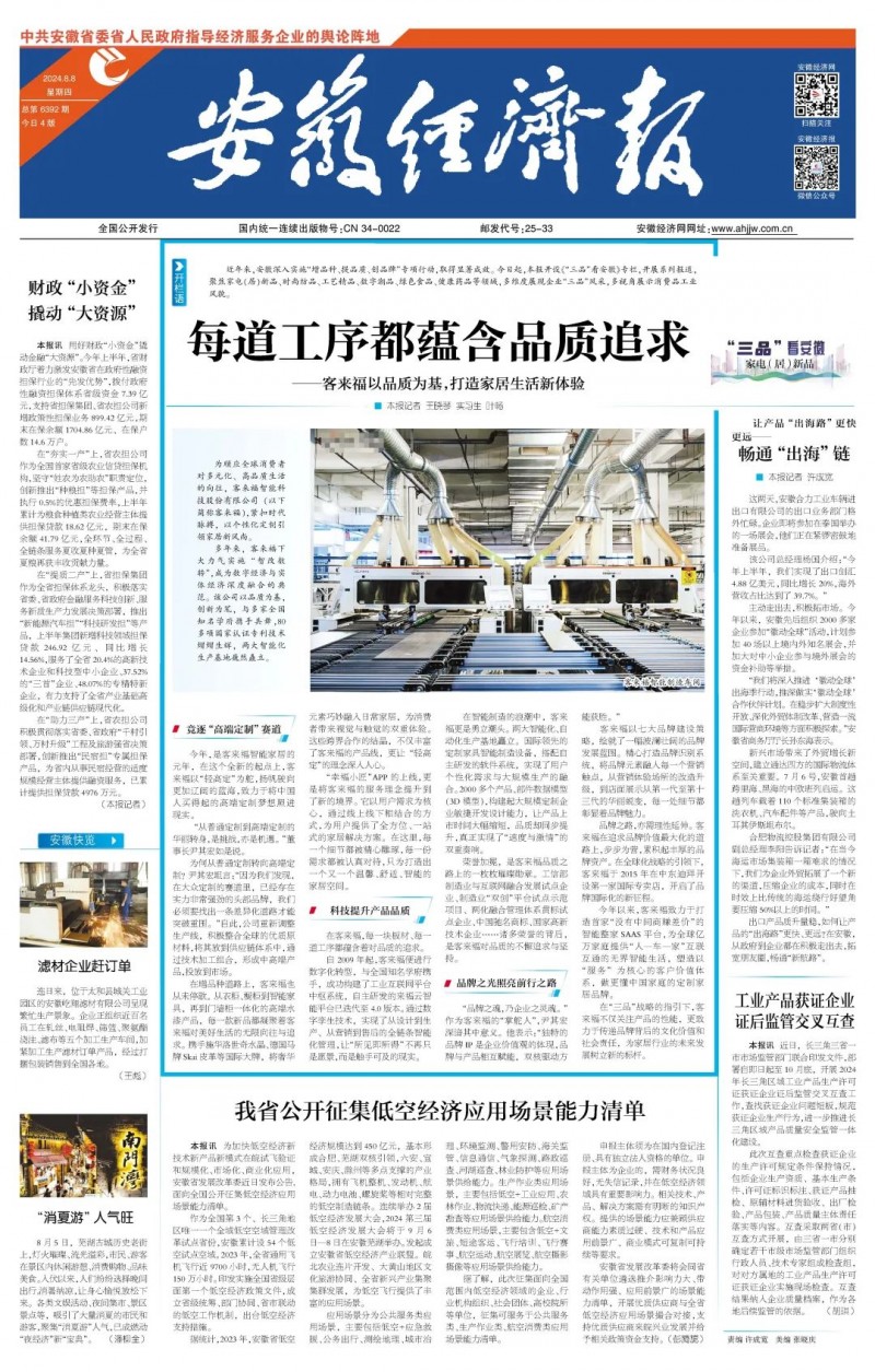 日前,安徽省工業(yè)和信息化廳聯(lián)合安徽經(jīng)濟(jì)報(bào)推出《“三品”看安徽》系列報(bào)道,走進(jìn)輕高定家居品牌客來福,聚焦在家居領(lǐng)域的創(chuàng)新成果。作為安徽“增品種、提品質(zhì)、創(chuàng)品牌”戰(zhàn)略的踐行者,客來福非常榮幸能夠代表安徽家居行業(yè),展示我們?cè)诟叨硕ㄖ祁I(lǐng)域的探索與成效。